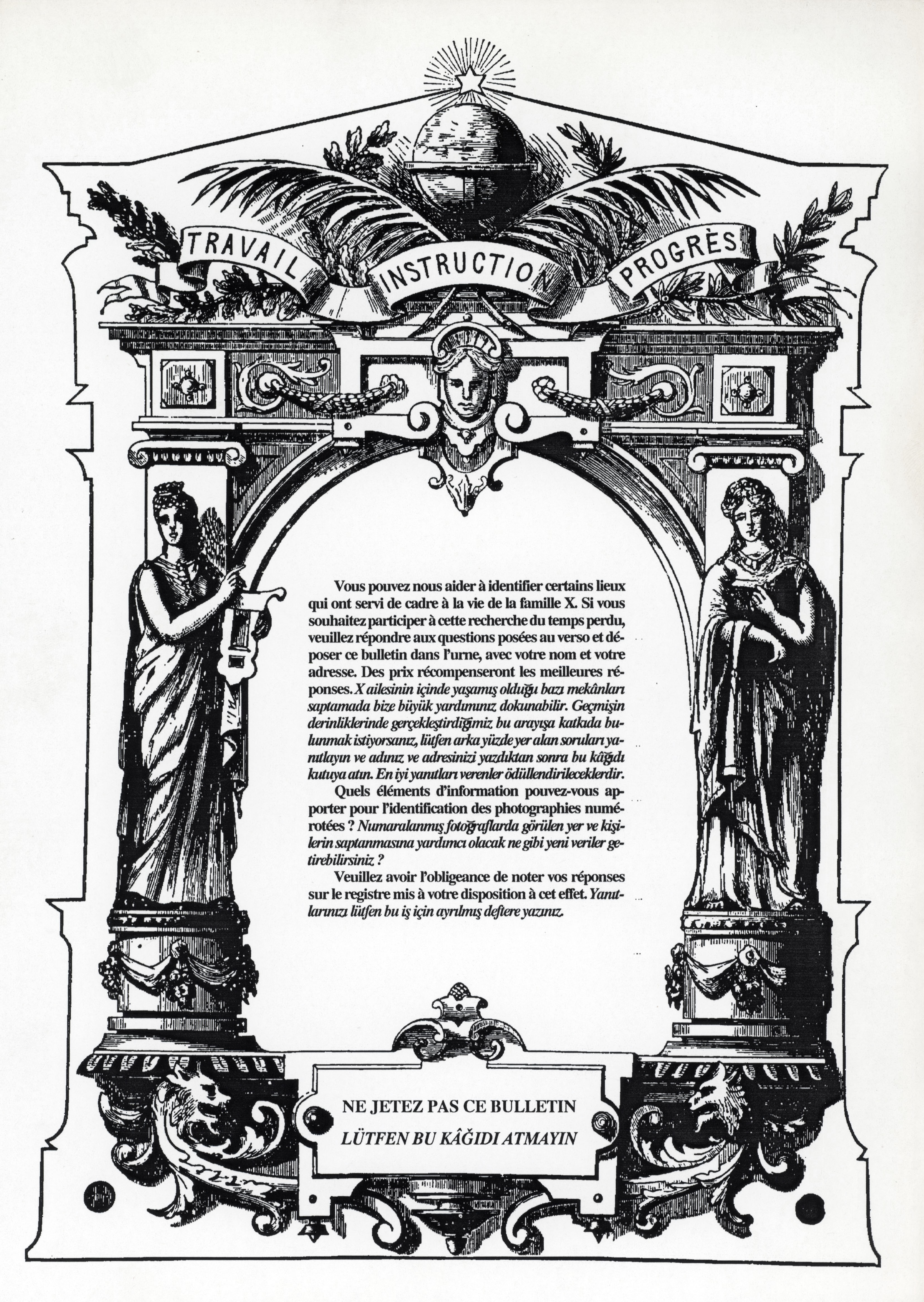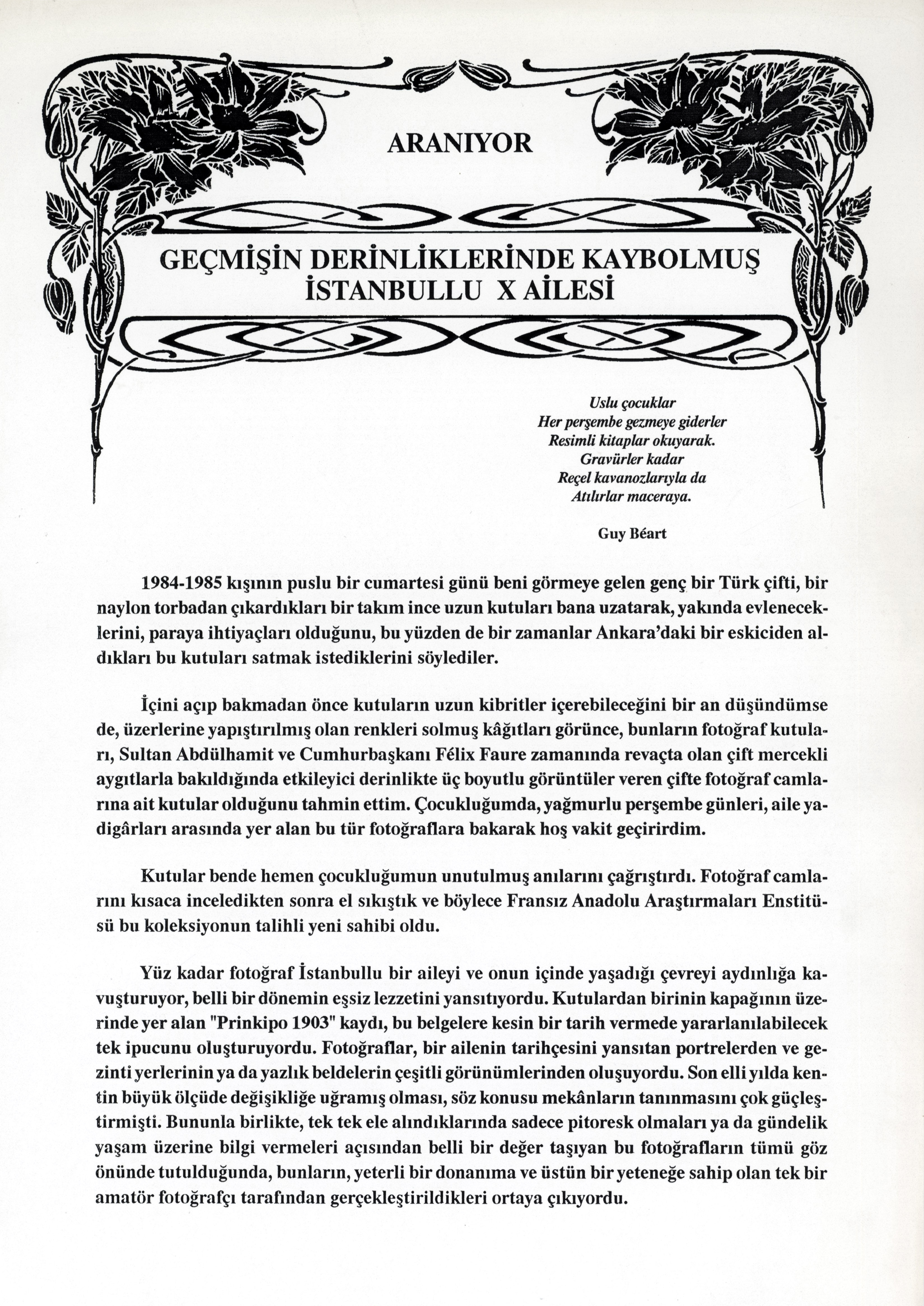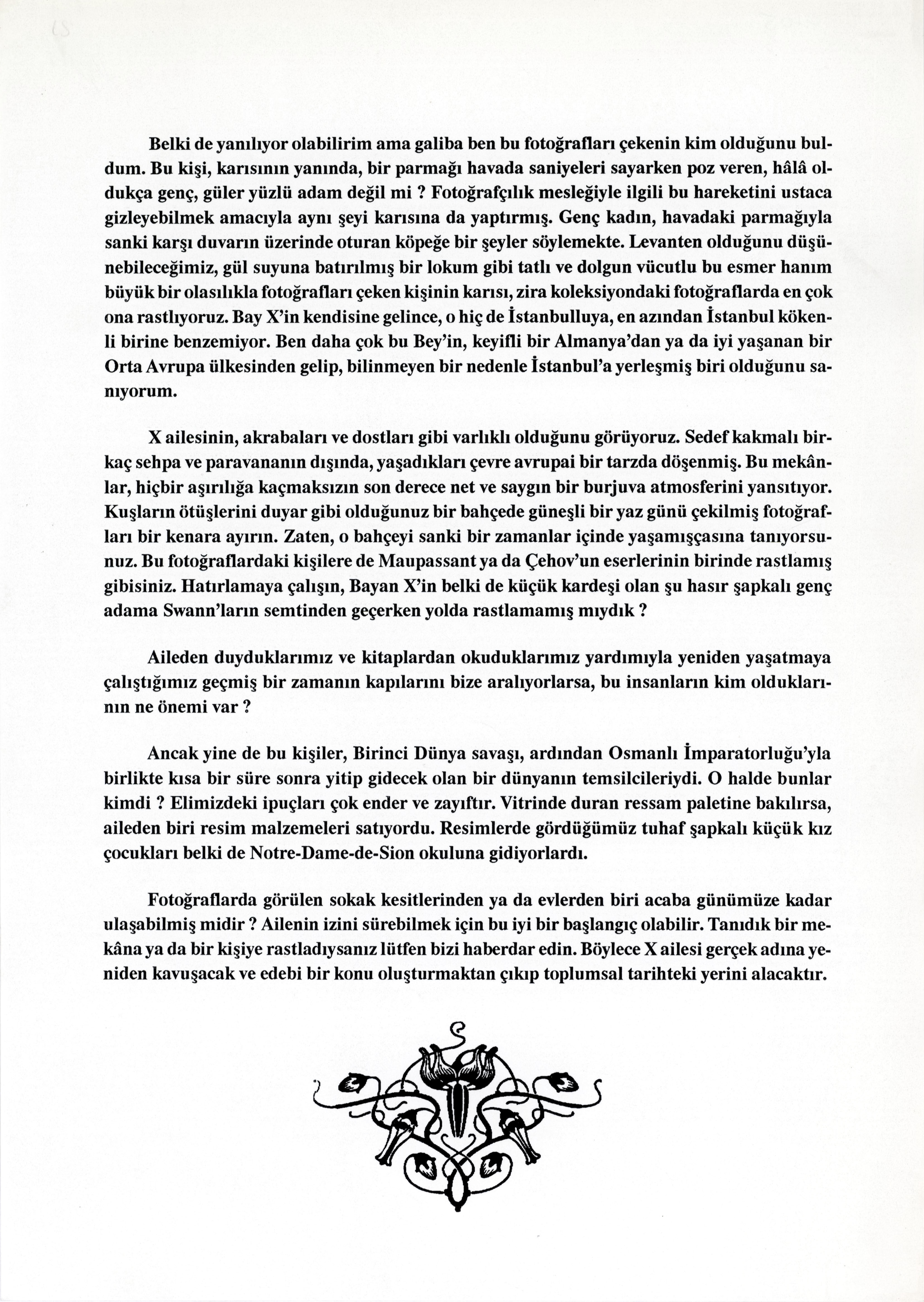 Fransız Anadolu Araştırmaları Enstitüsü’nün arşivlerini gün ışığına çıkarırken karşılaştığı ve yüzden fazla resimde yer alan bu aile kim? Bir yerlerde bu aileyi tanıyan kişilerin bulunacağını tahmin ediyoruz. Evleri, köşkleri hatırı sayılır bir yapı. Kıyafetleri, eşyaları, yaşantıları hakkında bir fikir veren bu fotoğraflar zengin kişiler olduklarını gösteriyor. Muhtemelen Levanten bir aile. Onlara dair tek bilinen 1900’lü yılların başında çekildiği düşünülen bir grup fotoğraftan arta kalanlar: eski İstanbul görüntüleri, Boğaz sahilinde geçen kışlar, yazın Büyükada günleri, Renoir-vari akşamüstü toplantıları, İstanbul’un unutulmaya yüz tutmuş tarihine bir bakış. Ne işle uğraşırlardı? Hangi dilde konuşurlardı? Ne yerlerdi, ne içerlerdi? Nelerden hoşlanırlardı? Bunları tam bilemesek bile tahmin etmek çok zor olmasa gerek. Asıl mesele ne oldukları. Ne zaman, nereye gittiler ve nasıl kayboldular?