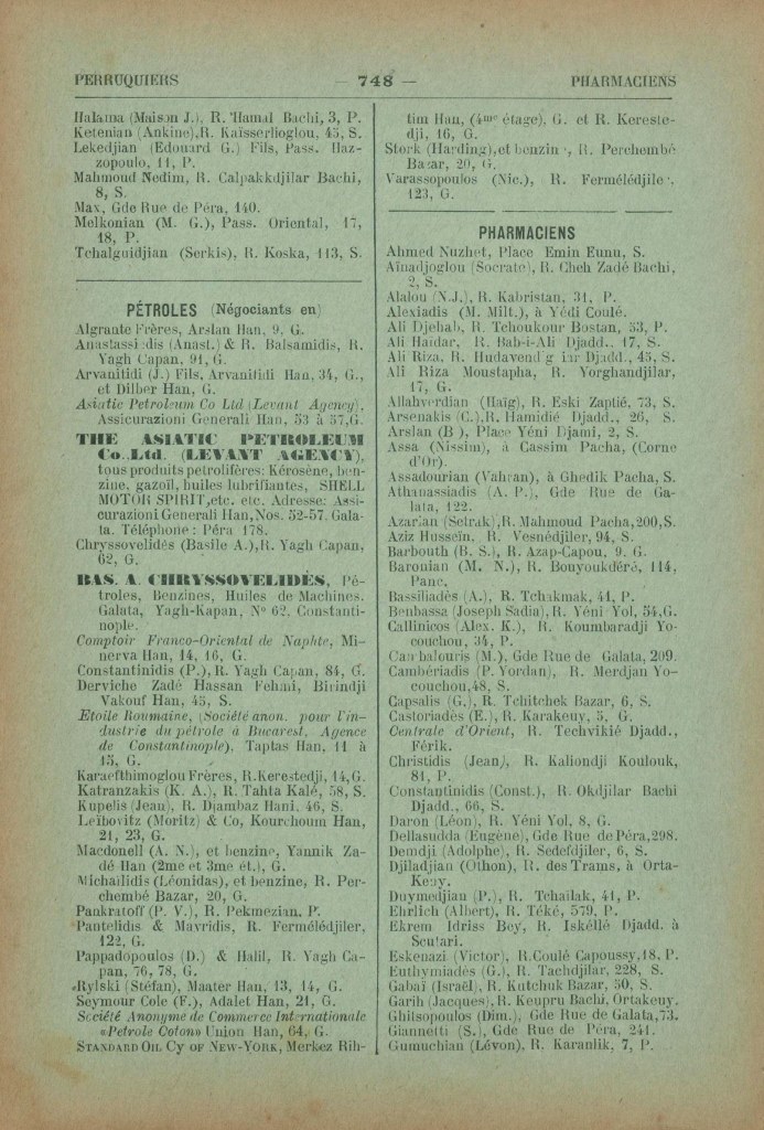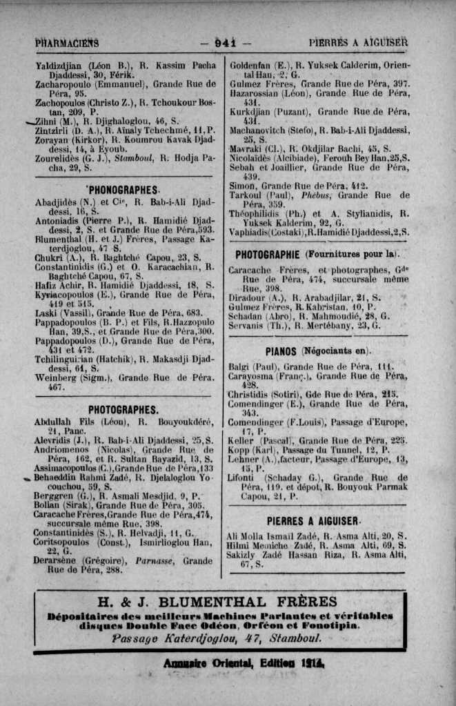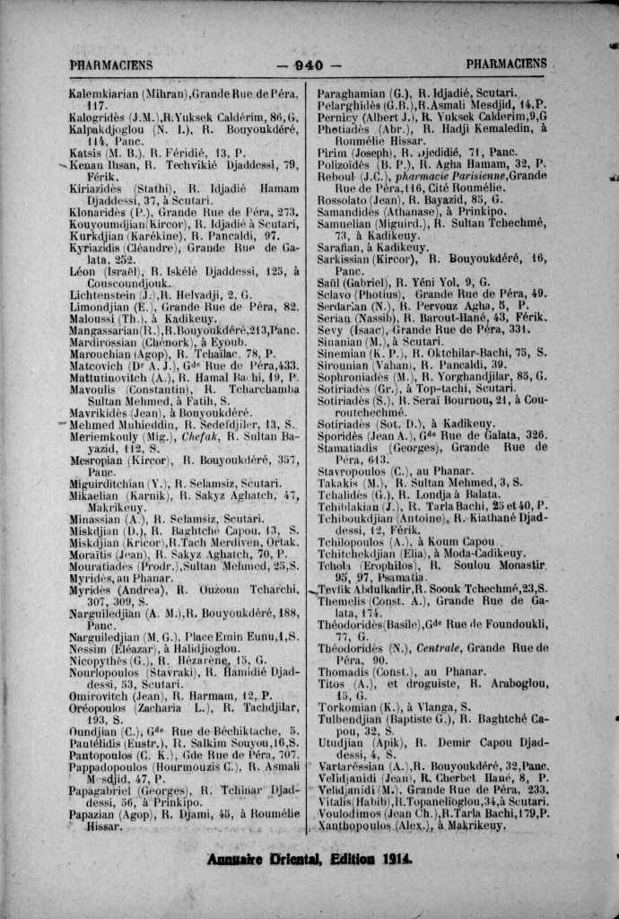 | 1914 | Dr. A. J. Matcovich | Kimyager | Avusturya-Macaristan Eczanesi | Cadde-i Kebir No. 433 | Mezarlık Sk. No. 1 Pera |