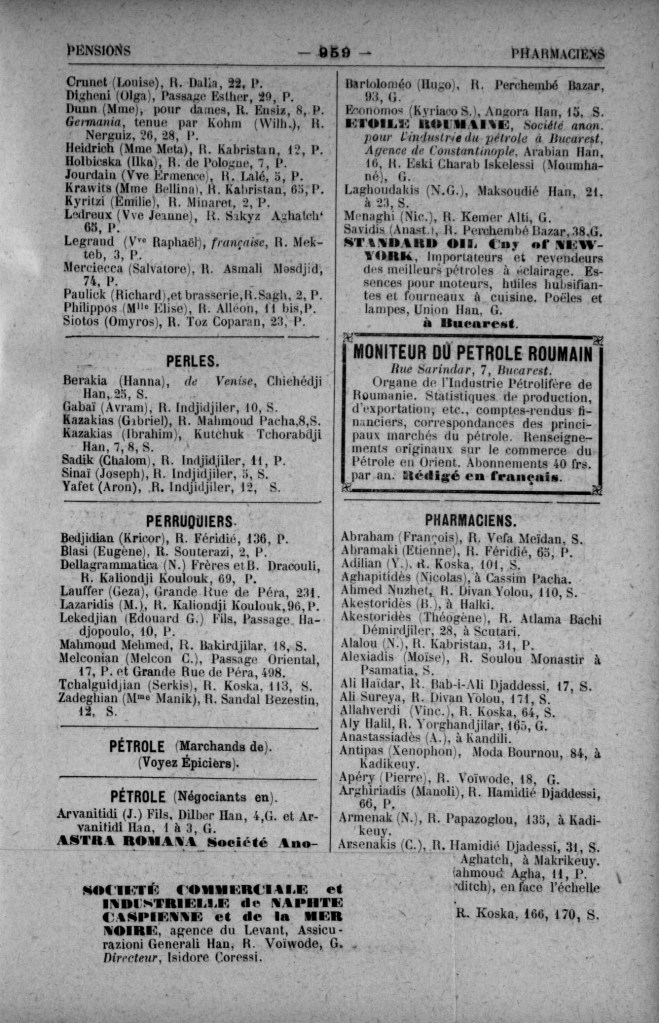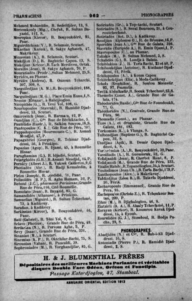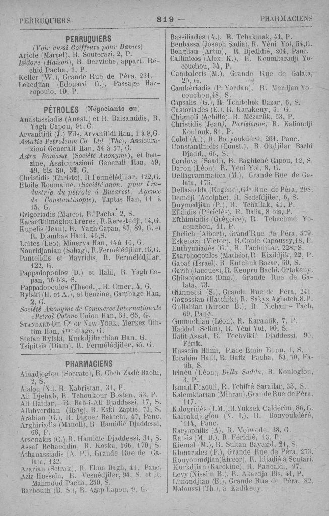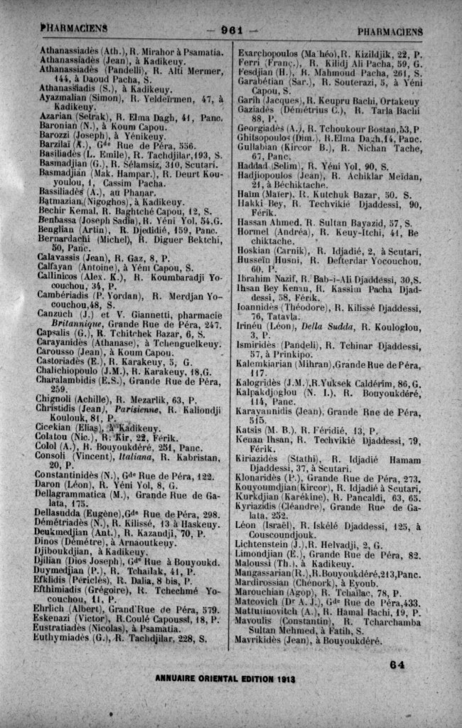 | 1913 | Dr. A. J. Matcovich | Kimyager | Avusturya-Macaristan Eczanesi | Cadde-i Kebir No. 433 | Mezarlık Sk. No. 1 Pera |