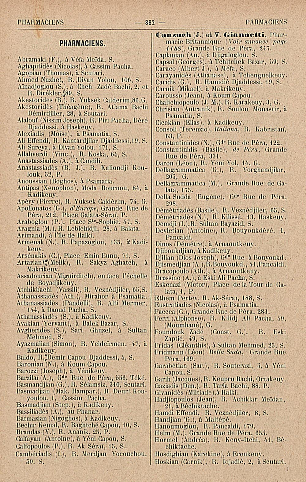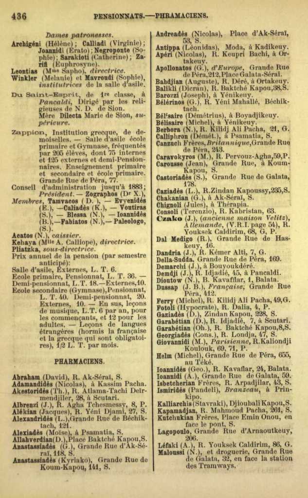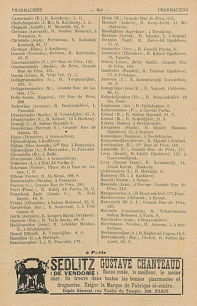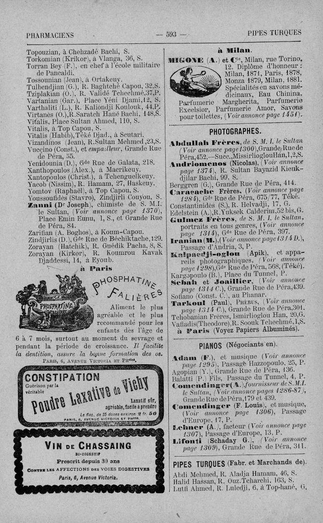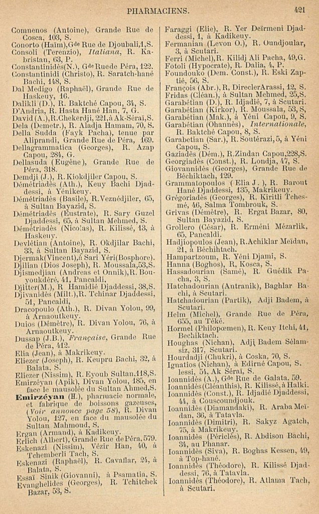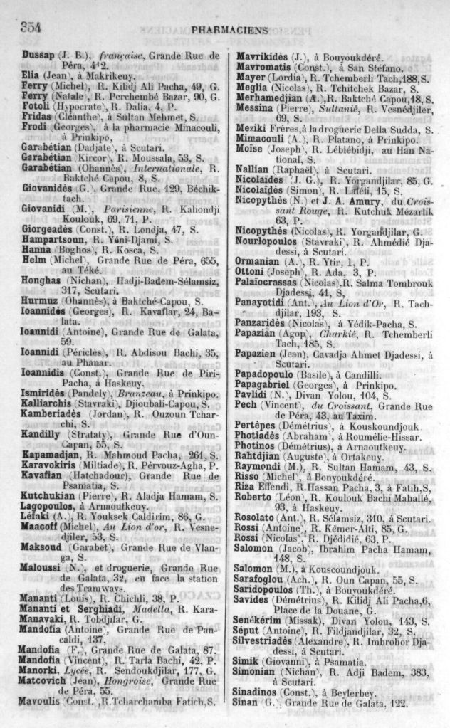 | 1892-93 | Adolphe Matcovitch | Eczacı | Cadde-i Kebir No. 465 | ||