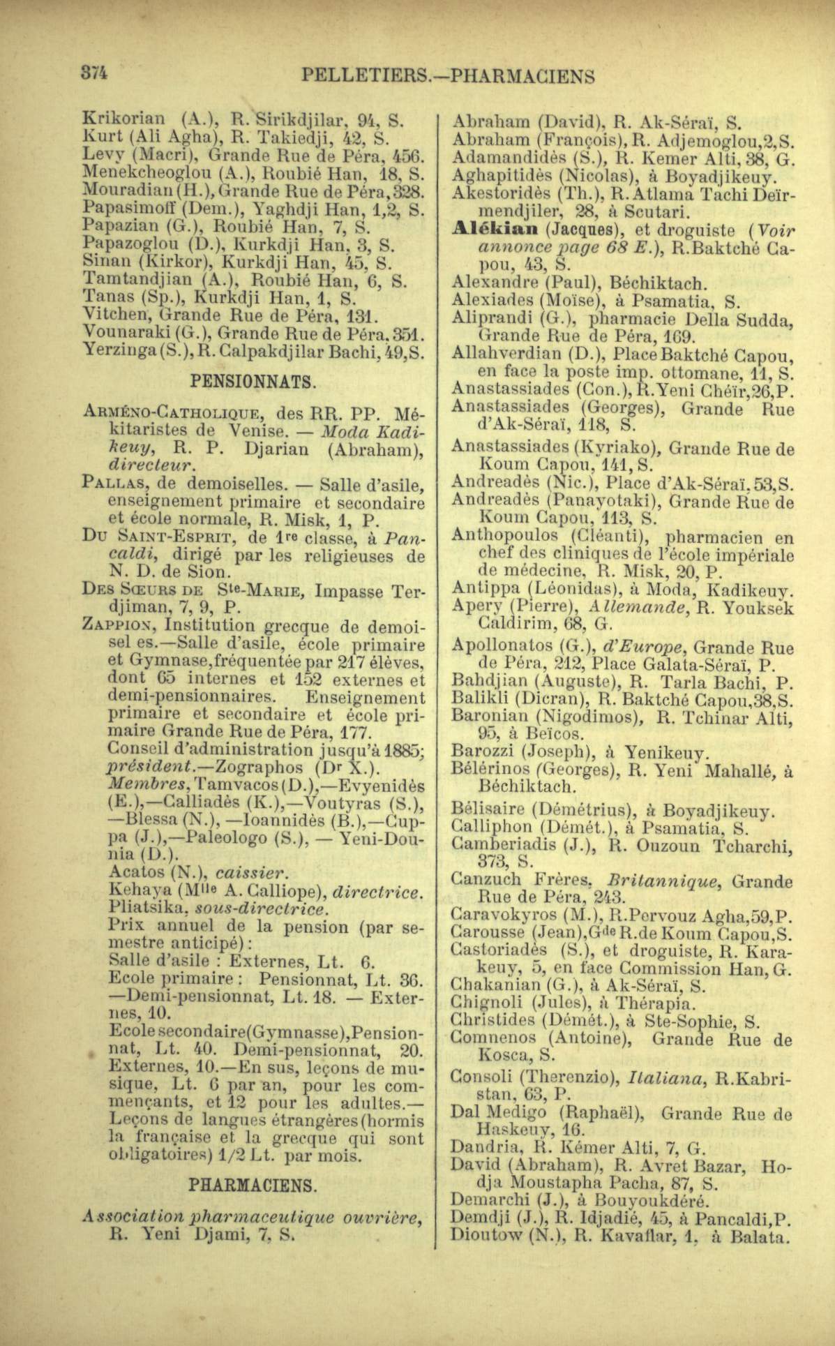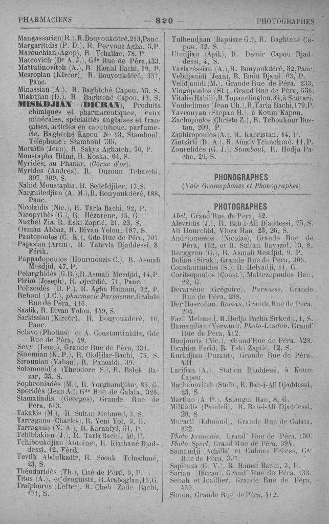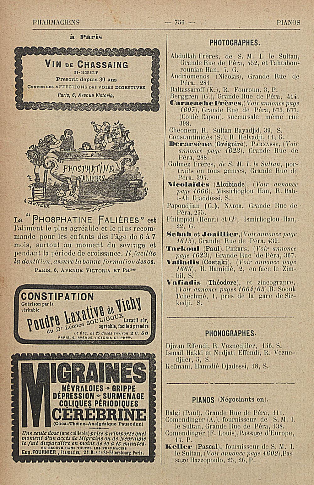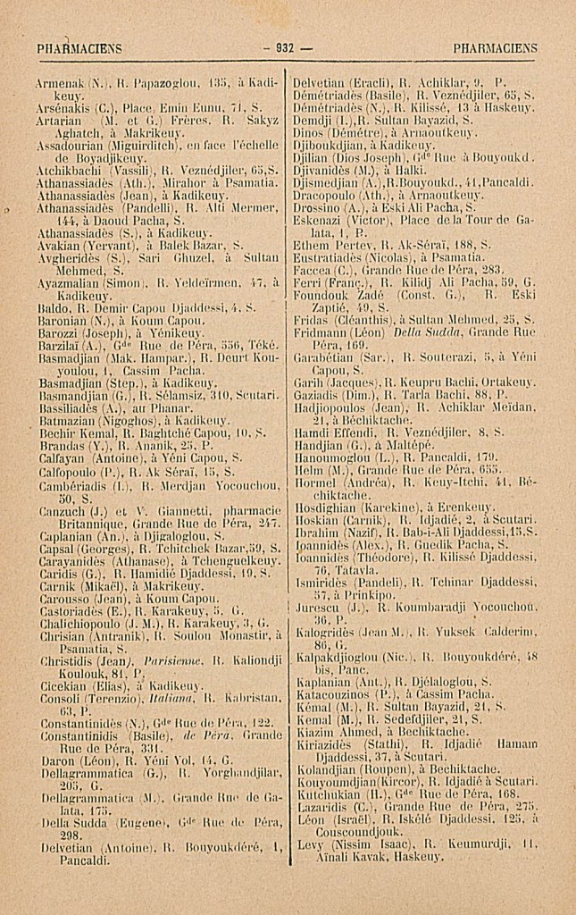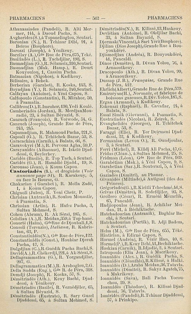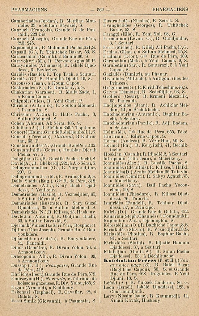 | 1892-93 | Adolphe Matcovitch | Eczacı | Cadde-i Kebir No. 465 | ||