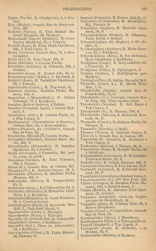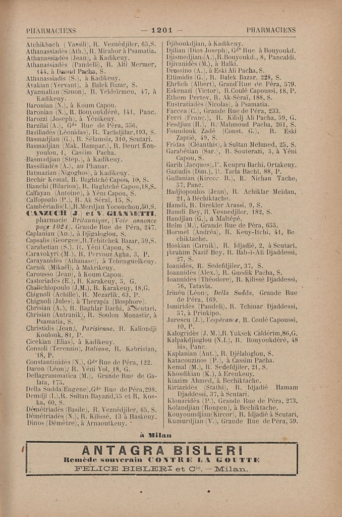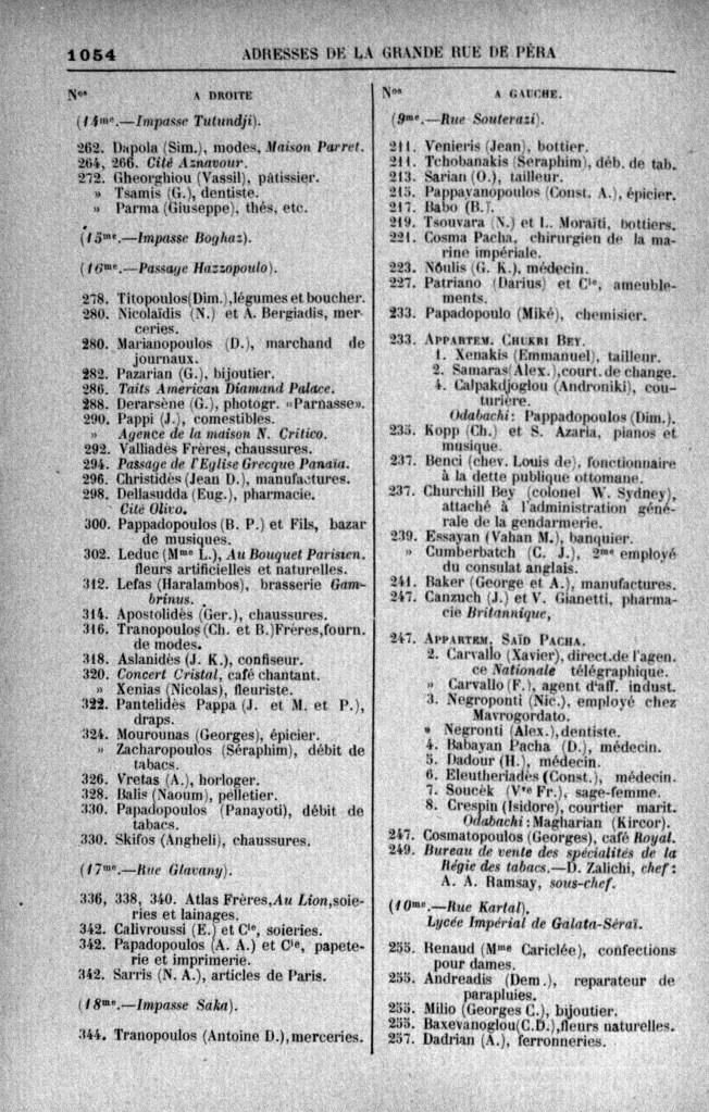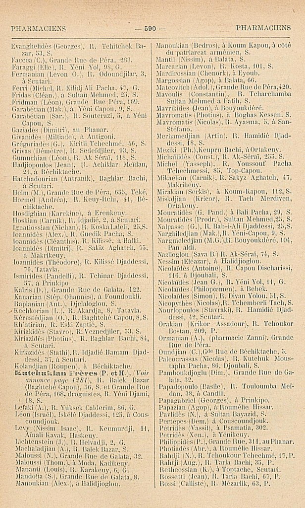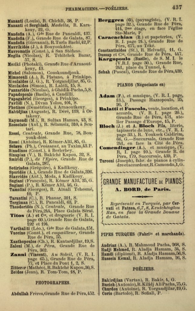| 1889-90 | Adolphe Matcovitch | Veznedar-muhasebeci | Britanya Eczahanesi | Sağ ve Sol Sokakları arasında No. 177 | Saksı Sk. No. 6 Pera |