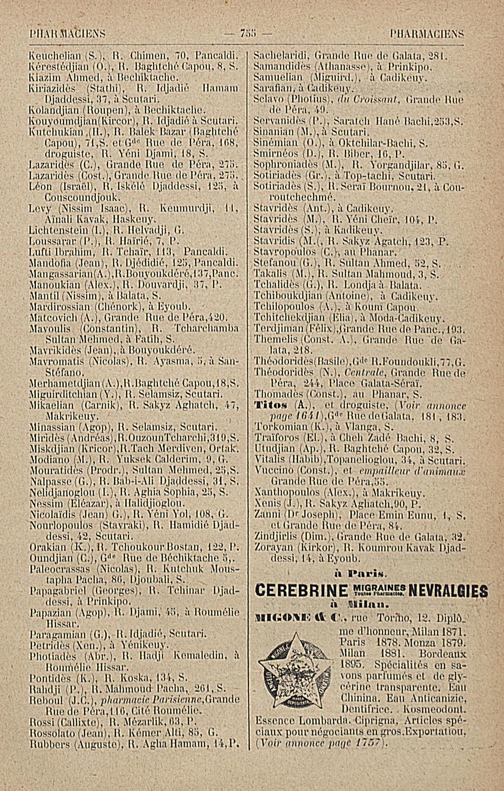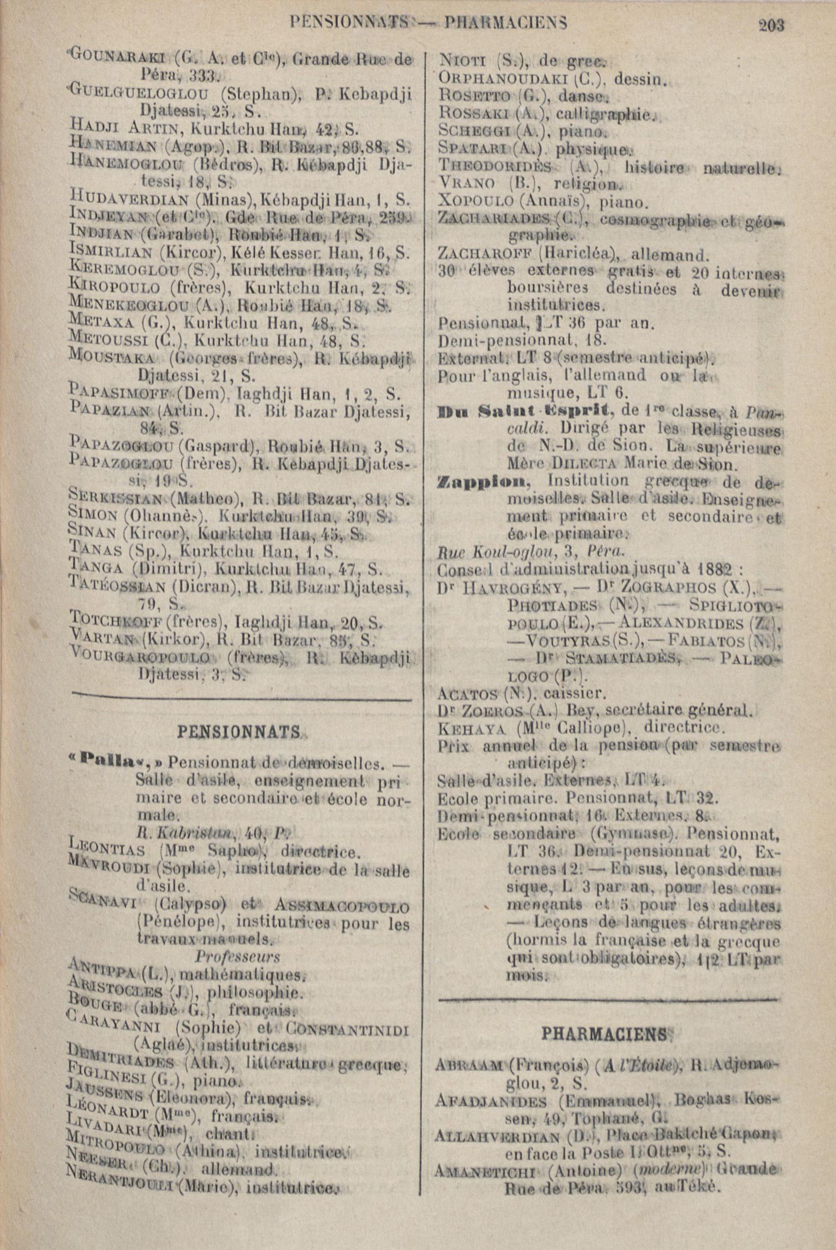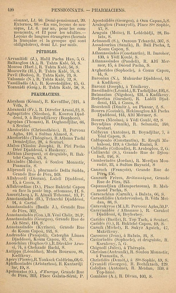 | 1889-90 | Adolphe Matcovitch | Veznedar-muhasebeci | Britanya Eczahanesi | Sağ ve Sol Sokakları arasında No. 177 | Saksı Sk. No. 6 Pera |