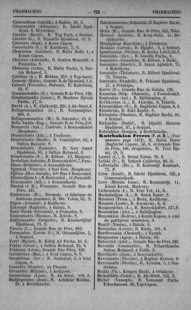 | 1922 | Dr. A. Matcovich | Kimyager | Eczane | Cadde-i Kebir No. 433 | Mezarlık Sk. No. 1 Pera |
