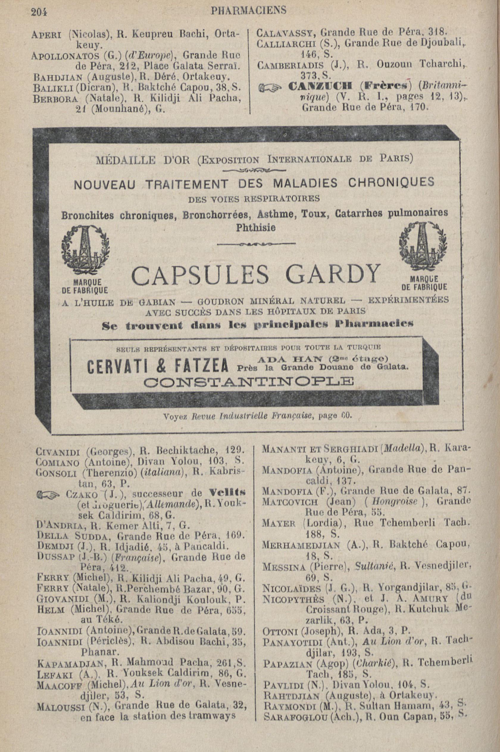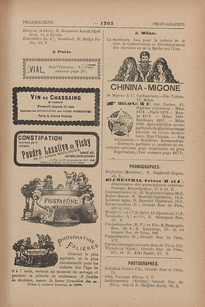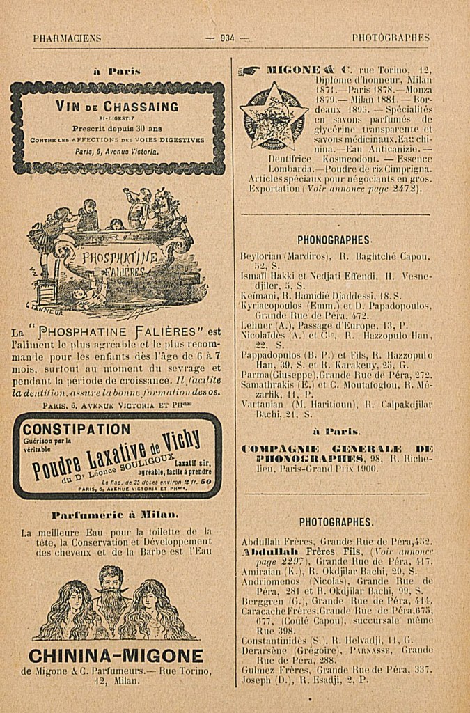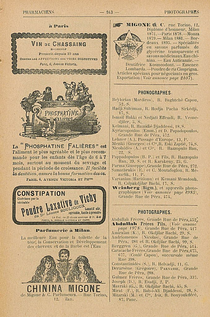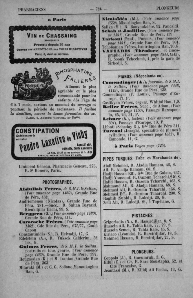 | 1900 | Adolphe Matcovitch ve Oğulları | Avusturya-Macaristan Eczahanesi ve Laboratuvarı | Cadde-i Kebir No. 420 ve Otoni Çıkmazı No. 9 Pera | Frederici Geçidi No. 6 Pera | |