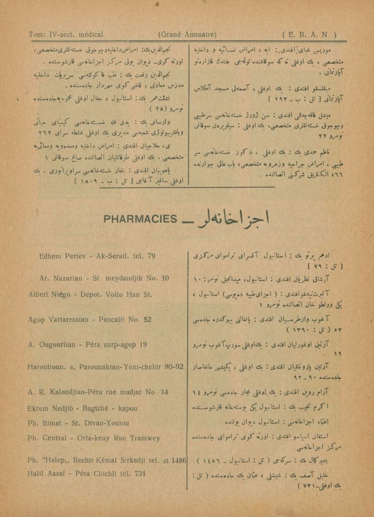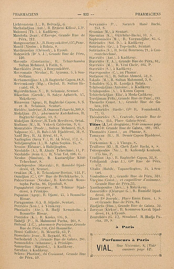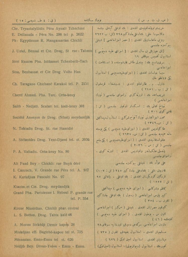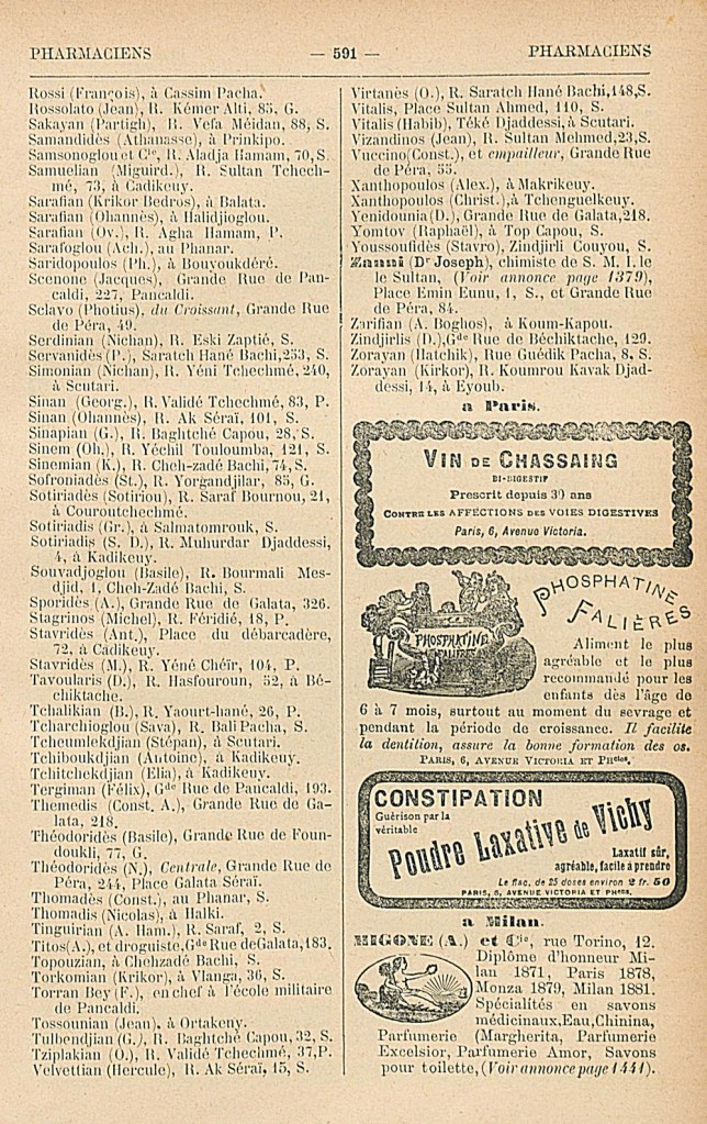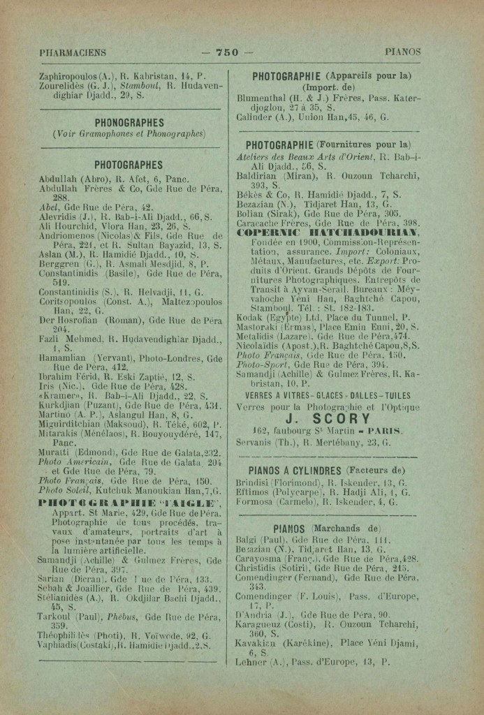 | 1900 | Adolphe Matcovitch ve Oğulları | Avusturya-Macaristan Eczahanesi ve Laboratuvarı | Cadde-i Kebir No. 420 ve Otoni Çıkmazı No. 9 Pera | Frederici Geçidi No. 6 Pera | |
