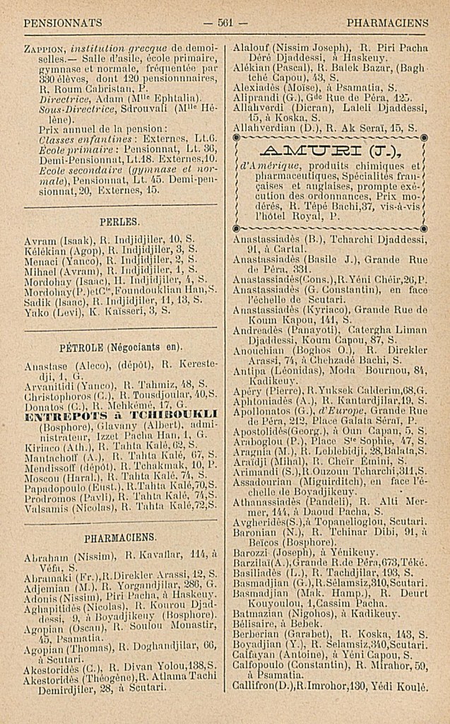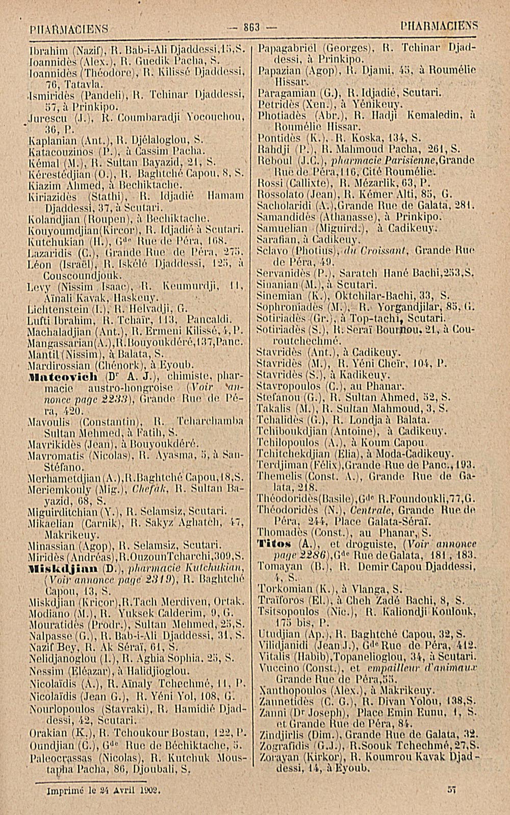 | 1903 | Dr. A.J. Matkovich | Kimyager | Avusturya-Macaristan Eczanesi | Cadde-i Kebir No. 420 | Mezarlık Sk. No. 8 Pera |