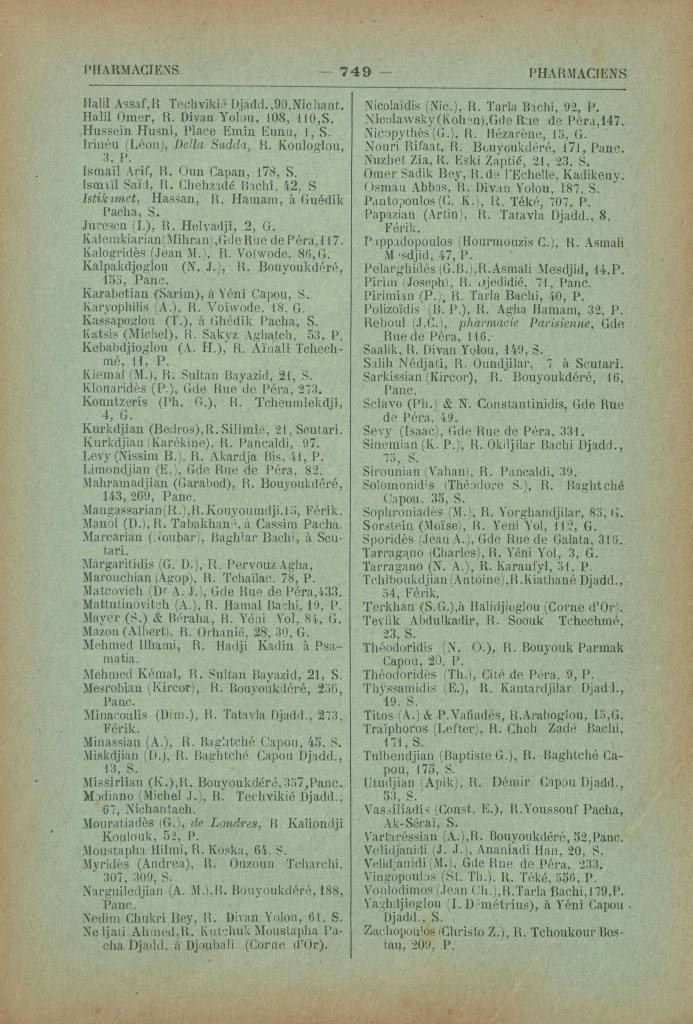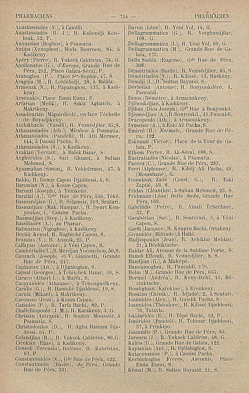 | 1908 | Dr. A. J. Matcovich | Kimyager | Avusturya-Macaristan Eczanesi | Cadde-i Kebir No. 433 | Mezarlık Sk. No. 1 Pera |