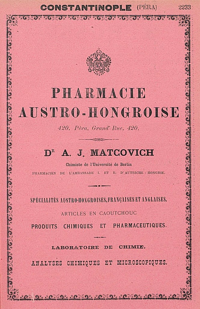 | “ | Dr. A.J. Matkovich | Kimyager | Avusturya-Macaristan Eczanesi | Cadde-i Kebir No. 420 | Cadde-i Kebir No. 449 Pera |