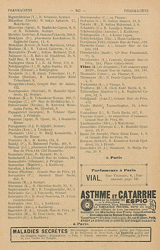 | 1912 | Dr. A. J. Matcovich | Kimyager | Avusturya-Macaristan Eczanesi | Cadde-i Kebir No. 433 | Mezarlık Sk. No. 1 Pera |