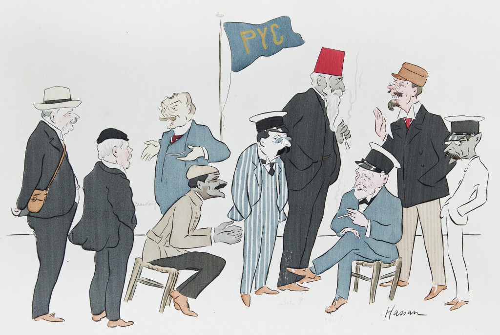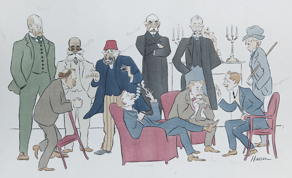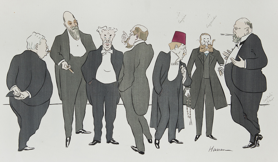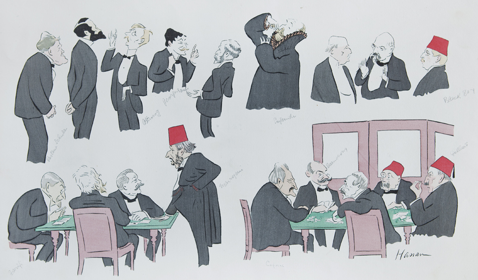 “Pierre Loti ve Hasan Siluetleri II. Meşrutiyet Öncesi Portreler” Sergisi kataloğunda yer alan PYC üyelerininkiler yanı sıra cümle çizimlere de dikkatlice bakarak Hotel Etrangers’nin verandasındaki eşhasın kimler olduğunu anlamaya gayretle…
