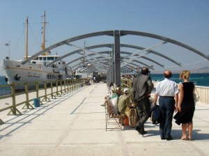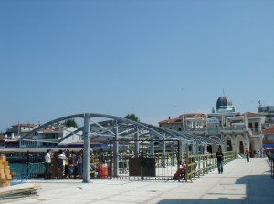 […] Vapur iskelesinden çıkarken sol tarafta, bugün de varolan Hrisafis Ksidas’ın gazete bayiine rastlardınız. Hemen bitişiğinde Todori Niklanoviç’in çiçekçi dükkânı, karşısında ve sağ tarafta Dimitri Karo ve Stelyo İkonomidis’ın berber dükkânları vardı. Birkaç adım ilerleyince Delakuridis Gazinosu’nun önünde seyyar çiçekçi, sempatik Stefani Amca’ya ve amberleriyle Alindayı’ya rastlardınız. […]